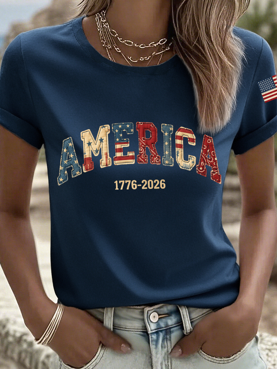 Women's America 1776–2026 Embroidered Pattern V-Neck T-Shirt