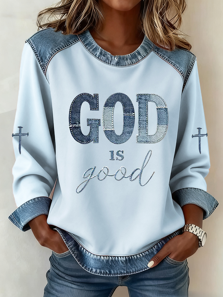 Women's God Is Good Cross Denim Patchwork Top