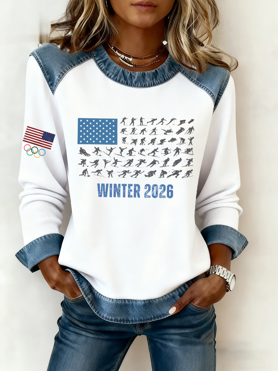 Women's USA Winter Sports 2026 Printed Denim Patchwork Sweatshirt