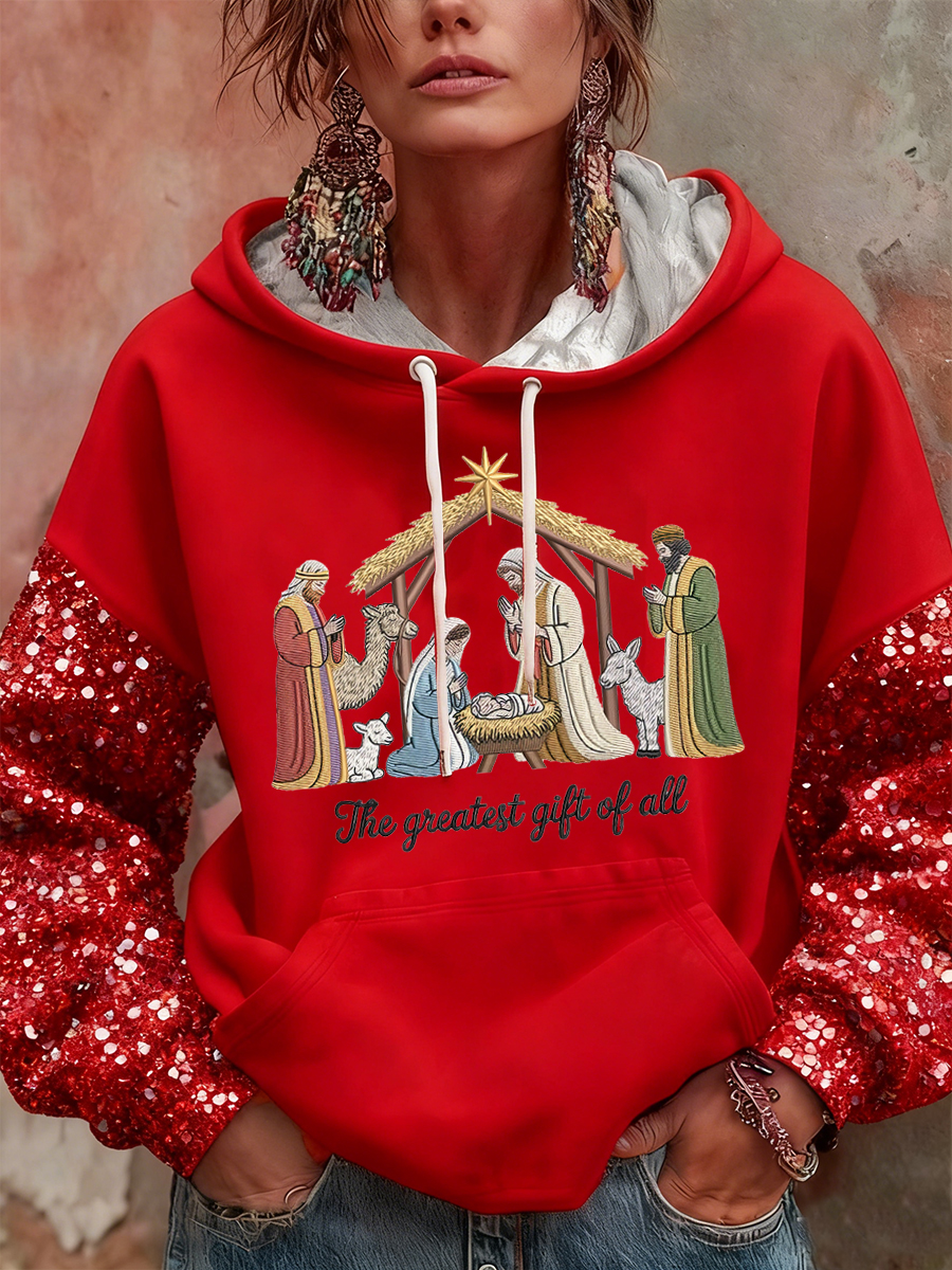 Women's The Greatest Gift Of All Jesus Nativity Christian Christmas Casual Flannel Hoodie